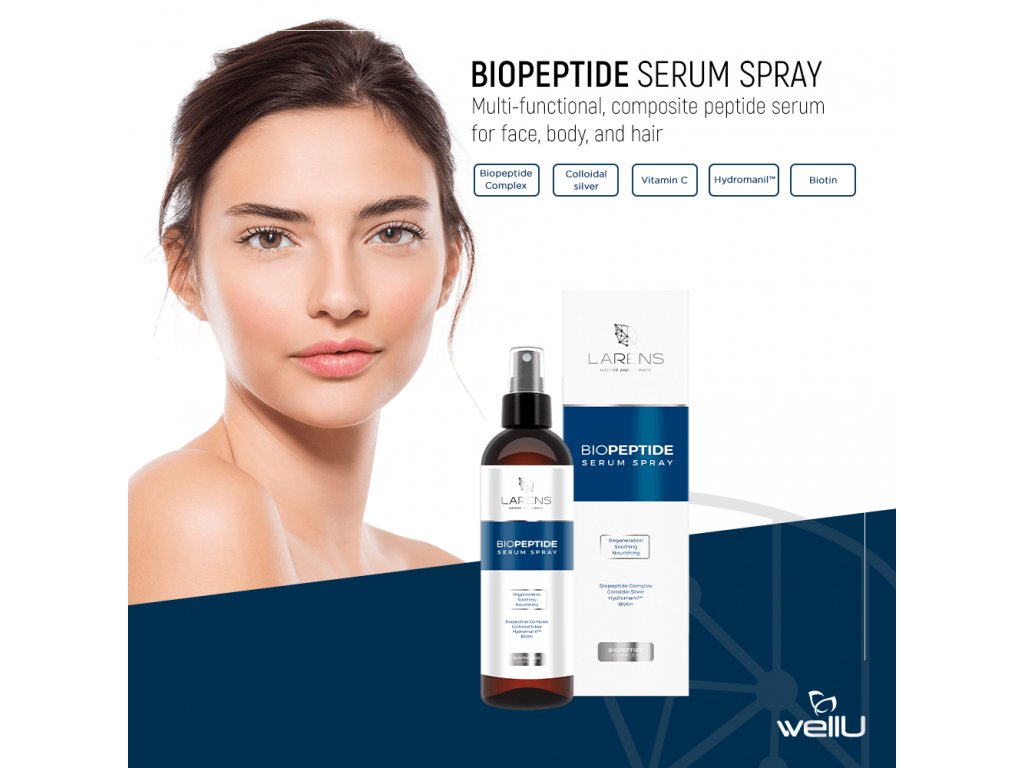Biopeptide Complex, který představuje základ Biopeptide Serum Spray, je soubor aktivních oligopeptidů a polypeptidů. Revoluční látky, jejichž objevení se stalo základem kosmeceutik značky Larens, byly velmi rychle vyhlášené za budoucnost kosmetologie a lékařské vědy v oblasti anti-aging přípravků. Peptidy účinkují třemi způsoby: signální – dávají podnět a stimulují fibroblasty k tvorbě kolagenu a elastinu, uvolňující – nazývané také ,,žehlička na vrásky” – uvolňují svaly odpovědné za vznik mimických vrásek a transportní – přenášejí aktivní látky obsažené v séru do hlubokých vrstev kůže, díky tomu se regenerace, vyživení a ochrana začíná od základů.